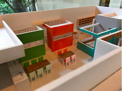 こちらの模型のグリーンとオレンジ部分のボックスにそれぞれ、トイレ・洗面台、キッチンをレイアウトしています。