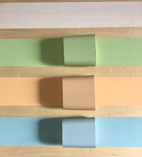 例えば、外部と内部など色を見る状況が違う場合は色の違いはあまり気にならないのですが、今回の場合は、同じ空間で隣り合わせに色が配置されているため、色の小さな違いによってイメージが変わってしまうため、非常に繊細な色合わせが必要になってきます。塗料サンプルを家具塗装工場に送って、何度か色合わせをお願いして、やっと満足できる同じような色で調合してもらうことができました。